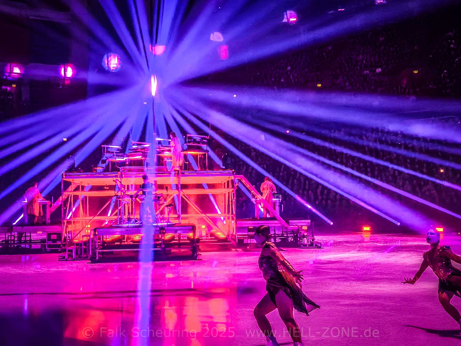 Das Spektakel beginnt: Aus dem künstlich-wabernden Bodennebel ragt mittig zentriert auf der Eisfläche, minimalistich-funktionell, die pyramidenartige Bühne für die sechs Musiker (Percussions, Synths und Vocals) heraus. Sie nehmen ihre Plätze ein, während die beiden Protagonisten eine Etage höher an ihre Maschinen gehen. „My Girl and I“ . Aus der Mitte schießt eine Laserkanone ihre Strahlen mit einer Kraft gegen die Decke, welchen den Globen wie den Todesstern in „Star Wars“ erscheinen lässt. In flackerndes Licht getaucht: Sänger Nicklas Stenemo als Zeremonienmeister, reckt die Arme nach oben, Jubel brandet auf und dabei bleiben alle Augen gebannt auf der Szenerie haften.