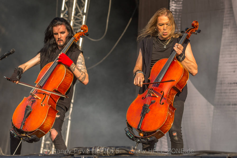 Es folgten Apocalyptica. Die Finnen sind mittlerweile eine Institution. Ihre Violoncellos spielen sie auf ganz besondere Weise. Die Band selbst bezeichnet ihr Genre als Cello Rock. Die drei Cellos werden lediglich von einem Schlagzeug als weiterem Instrument begleitet. Schon lange waren sie nicht mehr in Deutschland auf Festivals zu sehen und begeistern wie eh und je mit musikalischer Virtuosität. Bei diesem Set spielten sie, ganz "Back To The Roots" ausschließlich Metallica-Stücke, denn gerade huldigen sie mit dem aktuellen und zehnten Album "Plays Metallica Vol. 2" ihren großen Helden, denn . Die Zuschauer genossen und sogen es auf.