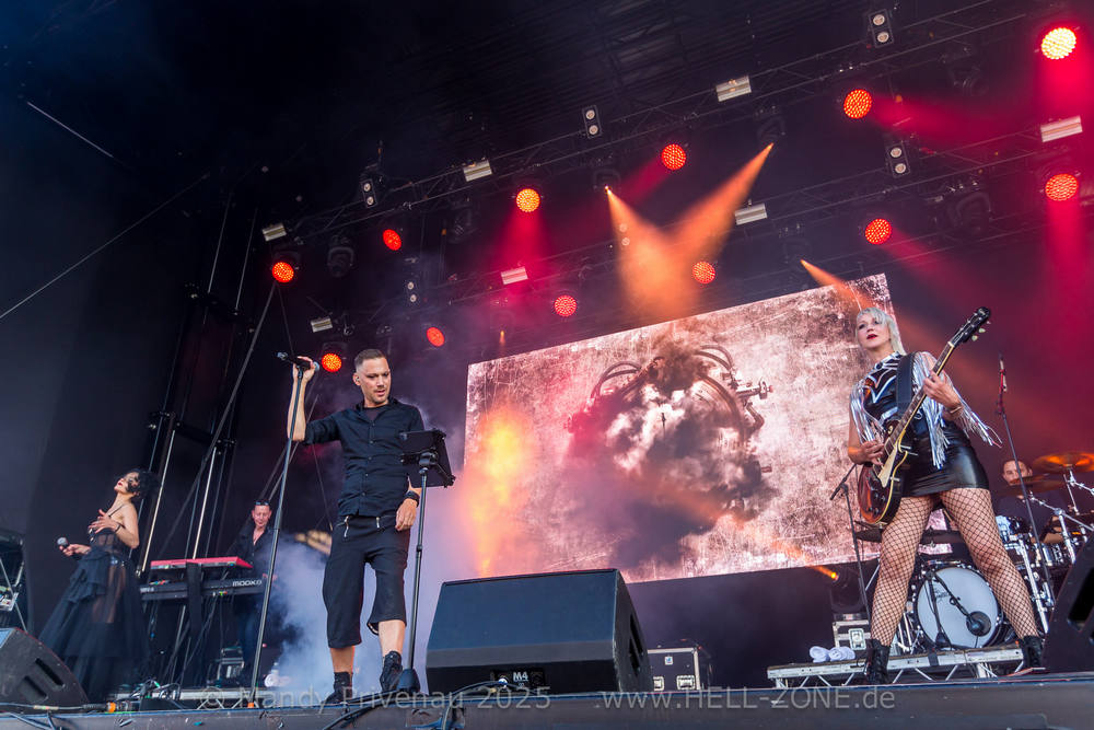 Im Anschluss übernahm Universum 25 das Ruder auf gleicher Bühne. Es handelt sich um eine deutsche Supergroup, die 2019 von Musikern verschiedener bekannter Bands gegründet wurde. Die Band besteht aus Michael Robert Rhein (In Extremo), Rupert Keplinger (Eisbrecher, ANTITYPE), Pat Prziwara (Fiddler's Green), Gunnar Schroeder (Dritte Wahl) und Alex Schwers (Slime). Das Debütalbum der Band erschien im Jahr 2023 und nun 2025 spielen sie das erste Mal auf dem Mera Luna Festival. Empfangen wurden sie mit großem Applaus. Ihr Mix aus Electro-Metal und Punk-Rock mit tiefgründigen Texten kommt super an, die Party ist im vollen Gange und der Zuschauerbereich ist stark gefüllt. Vor Allem „Der Traum ist aus“ und „Nur wegen dir“ wurden lautstark gefeiert.