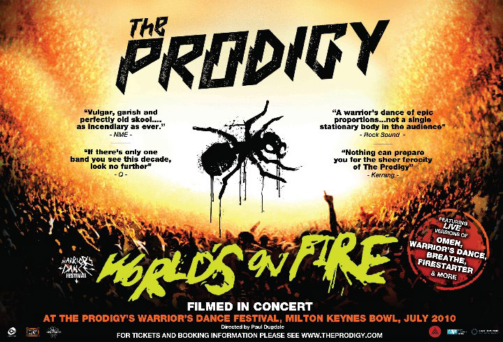 Du warst nicht dabei beim größten THE PRODIGY-Konzert aller Zeiten? Am 24. Juli 2010 spielte die Ausnahmeband vor sagenhaften 65.000 Zuschauern aus aller Welt auf dem ausverkauften Warrior's Dance Festival im National Bowl im englischen Milton Keynes.The Prodigy bringen jetzt den preisgekrönten Livemitschnitt auf die Leinwände deutscher Kinos! - WORLD’S ON FIRE