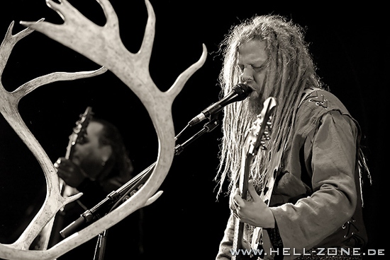 Die Finnenmetalvorband KOORPIKLANI hüpfte mit Fiedel und Fischerklavier über die Bühne, wie eine Ansammlung von Zwergen und legendenhaften Figuren. Doch innovativ hörte es sich vom ersten Ton an. Der typisch finnische „Märchenwald-Metal“ wird bei KOORPIKLANI von volkstümlichen, ja Polka-Elementen aufgefrischt. Die trendige Balkan-Gypsy-Welle hat nun also auch schon den Metal erreicht. Besonders interessant war es anzuschauen, wie das Publikum bei Melodien mitschunkelte, die in einer Silbereisen-dominierten Show genauso gut angekommen wären. - Nur wurden sie hier mit ein paar Bässen unterlegt. Dennoch war der kurze Auftritt angenehm trashig und überraschend melodisch.Was allerdings sofort in der restlos ausverkauften Halle auffiel, war das gewöhnungsbedürftige Publikum. Ich dachte mich zu erinnern, dass vor einigen Erdrotationen ein anderes Publikum IN EXTREMOs Fanbase gegründet hat. Mittelalterliche Kleider, Glöckchengebimmel, Schottenröcke und tiefes Schwarz suchte ich nun vergebens. Die vereinzelten Gruftieblöcke schienen mittlerweile fast fehl am Platz oder wie Relikte aus einer längst vergessenen Vergangenheit. Das Familiäre war komplett abhanden gekommen. So kam auch ich mir völlig deplaziert zwischen dauergewellten Muttis und Jeansanzug Vatis nebst ihrer Bälger vor. Familienausflug oder doch eher Volksfestatmosphäre? Glücklicherweise entschädigte das Konzert und