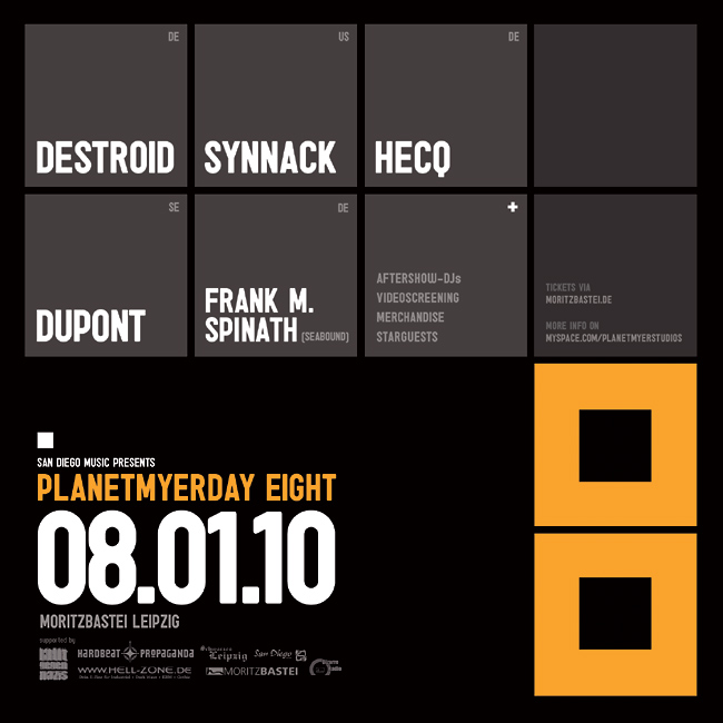 Merkt euch schon einmal vor: Am 07.01.2011 wird es den „PLANET MYER DAY Nr. 9“ geben. Neben DESTROID und KLANGSTABIL werden noch EMPUSAE und SUBHEIM die Bühne rocken.Und wir freuen uns drauf:-)