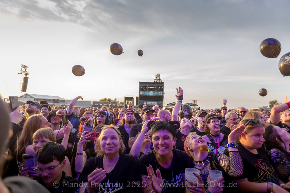 Im Anschluss übernahm Universum 25 das Ruder auf gleicher Bühne. Es handelt sich um eine deutsche Supergroup, die 2019 von Musikern verschiedener bekannter Bands gegründet wurde. Die Band besteht aus Michael Robert Rhein (In Extremo), Rupert Keplinger (Eisbrecher, ANTITYPE), Pat Prziwara (Fiddler's Green), Gunnar Schroeder (Dritte Wahl) und Alex Schwers (Slime). Das Debütalbum der Band erschien im Jahr 2023 und nun 2025 spielen sie das erste Mal auf dem Mera Luna Festival. Empfangen wurden sie mit großem Applaus. Ihr Mix aus Electro-Metal und Punk-Rock mit tiefgründigen Texten kommt super an, die Party ist im vollen Gange und der Zuschauerbereich ist stark gefüllt. Vor Allem „Der Traum ist aus“ und „Nur wegen dir“ wurden lautstark gefeiert.