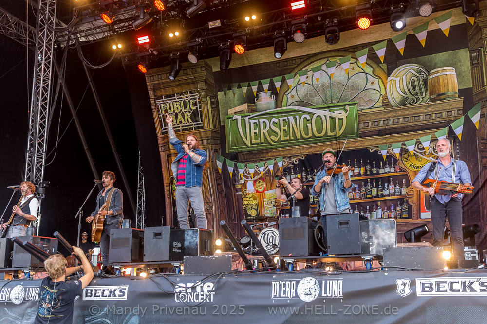 Versengold stehen für Spaß am Musizieren und Texten! Die Mischung aus elektronischen und klassischen Instrumenten, weit weg von traditioneller Fiedelmusik, spricht eine Vielzahl an Besuchern an. Bei bestem Sonnenschein singen sie aus lauter Kehle die Refrains mit und jubelten im Chor. „Kobold im Kopf“, „Mädchen hinter der Bar“ oder „Butter bei dir Fische“ sind nur einige Hits, die lauthals mitgesungen wurden. Etwas seltsam erscheint die Erste, wohl offensichtlich nicht ernst gemeinte, Verabschiedung der Band bereits nach dem fünften Song. Klar, dass es hier noch Zugaben geben musste. Oder eben, der Rest vom eigentlich angedachten Set... .